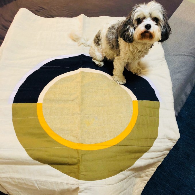 I think it looks like the flag of an alien planet in a sci-fi movie. That’s not a criticism. I appreciate the tension that exists between the quilt’s modern design and homey materials of cotton and linen.