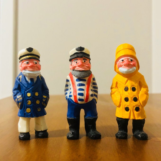 I chose a set of three 2.5-inch-tall sea captains carved from wood. All three bearded figures look like Ernest Hemingway, and each has the same pose: standing with his hands in his pockets.
