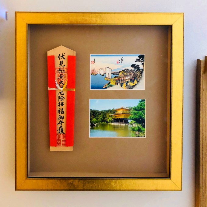 Behind the glass of the frame, a reproduction of a woodblock print and a photo of Kinkaku-ji (aka the Temple of the Golden Pavilion) in Kyoto are displayed next to a wooden plaque with a prayer written on it in Japanese. You can buy these little boards (ema) at Shinto shrines—only you’re supposed to leave the thing hanging at the shrine for the spirits to receive your prayer, not put your prayer behind glass at a Michaels.