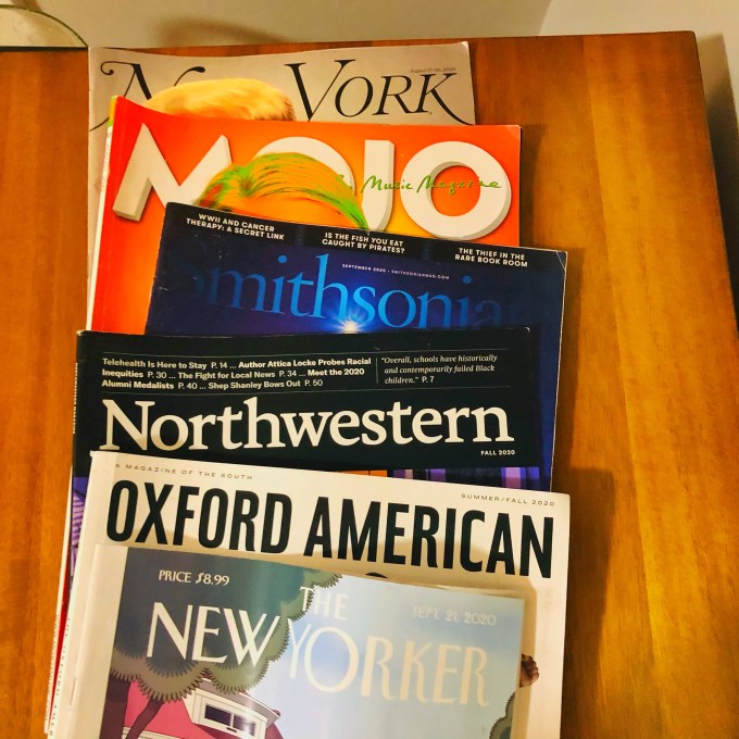 The other periodicals I get are the biweekly New York magazine, monthlies Mojo and Smithsonian, the quarterly alumni magazine from Northwestern University, and the Oxford American, which ostensibly comes out four times a year but don’t set your watch to the schedule—we’re talking about a literary enterprise and funding is fickle.