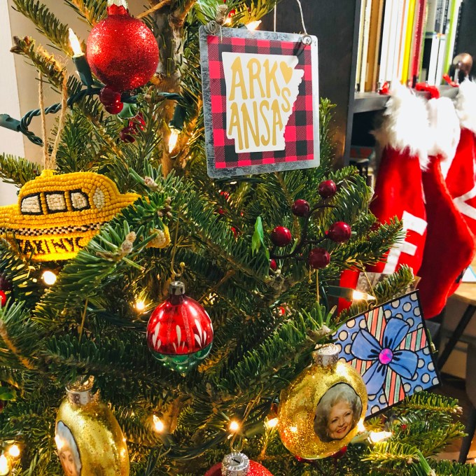Among the festive finery festooning Treena’s branches are string lights; sprigs of fake berries; a wicker star; red and golden glass balls; four glass Golden Girls balls, each bearing a different photo—one for Dorothy, Rose, Blanche, and Sophia; colorful construction-paper creations from one of my sister’s children; a white disk stamped with 2020’s buzzwords such as “Zoom” and “Flatten the curve” (my mom sent me this item in the mail); and ornaments shaped like Arkansas (my home state), a yellow New York City taxicab, the letter “F” (for my husband, Frank; the matching “Z” for Zac is lost), and Quebec Winter Carnival mascot Bonhomme, whom I suspect of being a disguised Michelin Man hiding out in Canada to avoid paying child support for his son, the Pillsbury Doughboy.