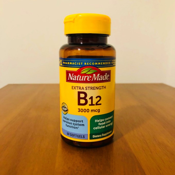 Evidently, your body gets the vitamin, which helps make red blood cells and supports nervous system function (according to the Nature Made label), from animal products. So if you don’t eat those, you’re at risk, says WebMD, of growing weak and pale and depressed and prone to heart palpitations.