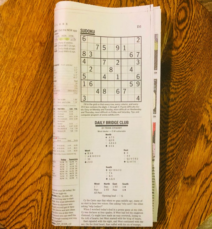 In the Globe, the puzzle appears next to the weather forecast and above Frank Stewart’s Daily Bridge Club, a column, with diagrams, about some imaginary people being tediously folksy and playing your great-aunt Doreen’s favorite card game.