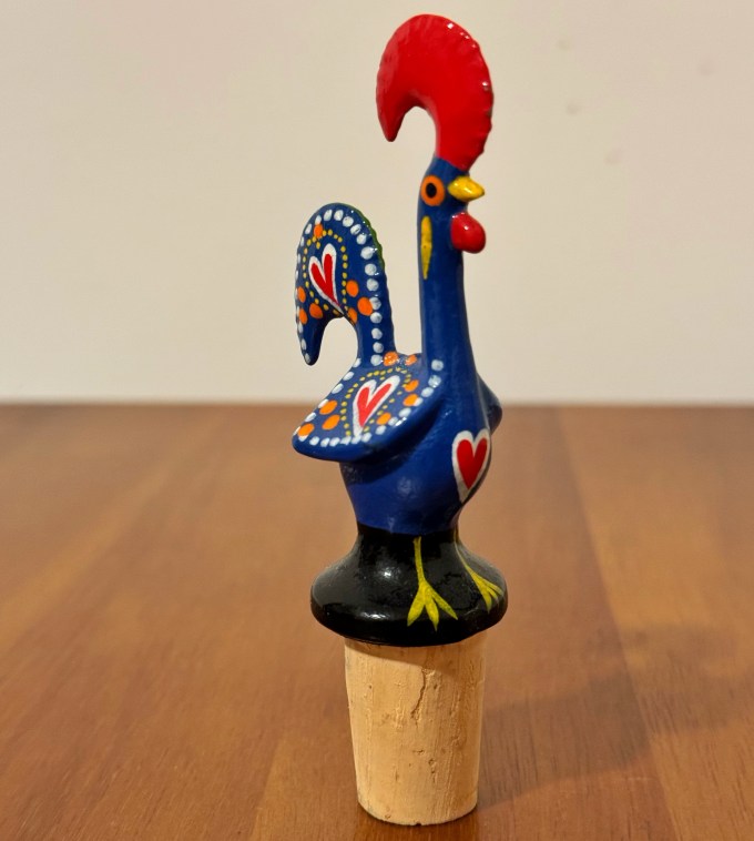 Nowadays, souvenir iterations of the rooster are ubiquitous throughout Portugal—not only in the northern city of Barcelos, where the folktale is set, but everywhere trinkets are sold. My husband, Frank, purchased a wine stopper version during our Portugal vacation back in 2017.