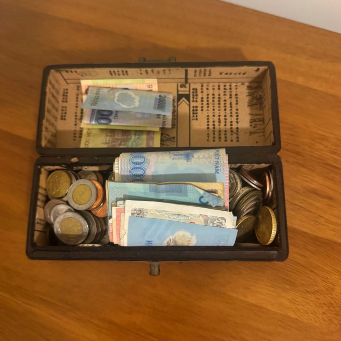 Inside the pencil case, Frank stores a roll of pastel-colored notes in small denominations from several international locales he has visited over the years, including Argentina, Egypt, India, Vietnam, and, less interesting from my North American perspective, Mexico and Canada. The box also contains a bunch of coins from various places.